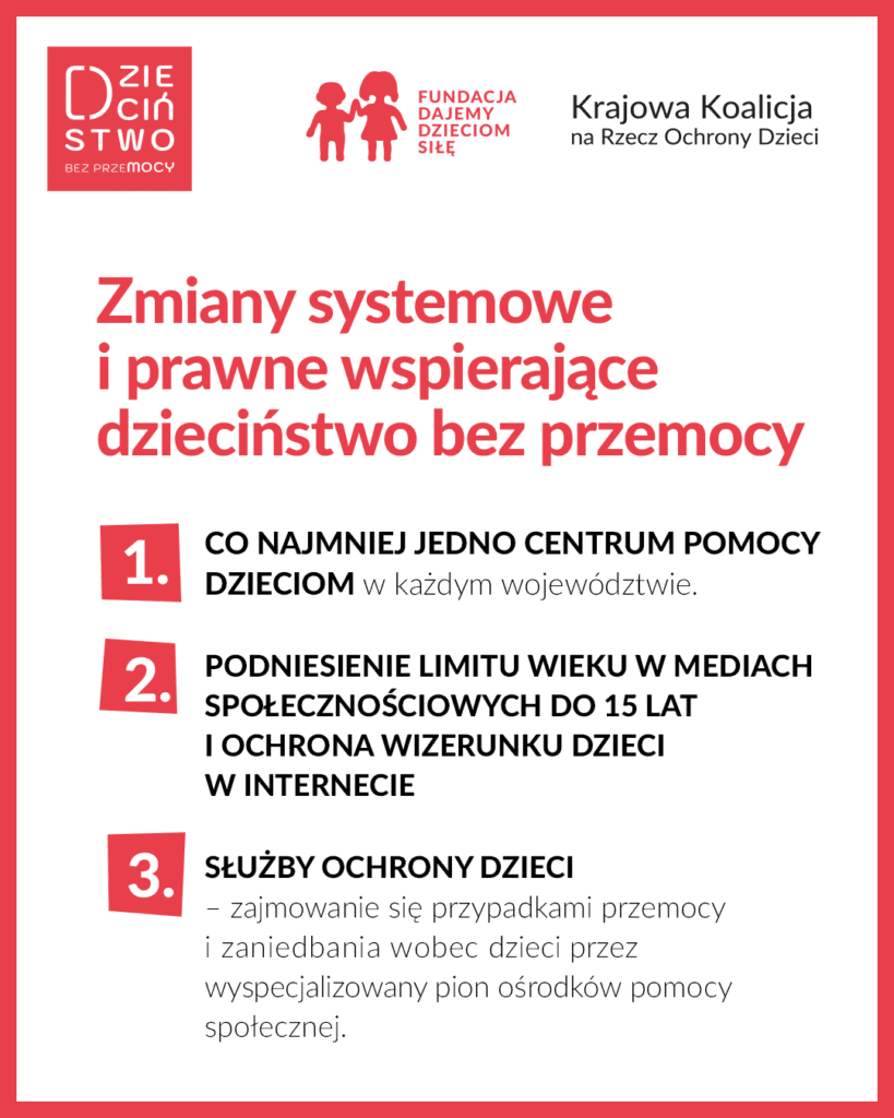 Fundacja Dajemy Dzieciom Siłę wraz z Krajową Koalicją na rzecz Ochrony Dzieci podczas finału drugiej edycji kampanii Dzieciństwo bez Przemocy ogłosiły trzy postulaty zmian prawnych i systemowych, które mają sprawić, by dzieci w Polsce były bezpieczne. Finał odbył się 19 listopada, w Międzynarodowy Dzień Przeciwdziałania Przemocy wobec Dzieci. W ramach akcji w całej Polsce podejmowane były inicjatywy edukacyjne, a w dniu finału tysiące budynków podświetlono na czerwono, by symbolicznie wyrazić sprzeciw wobec krzywdzenia dzieci.